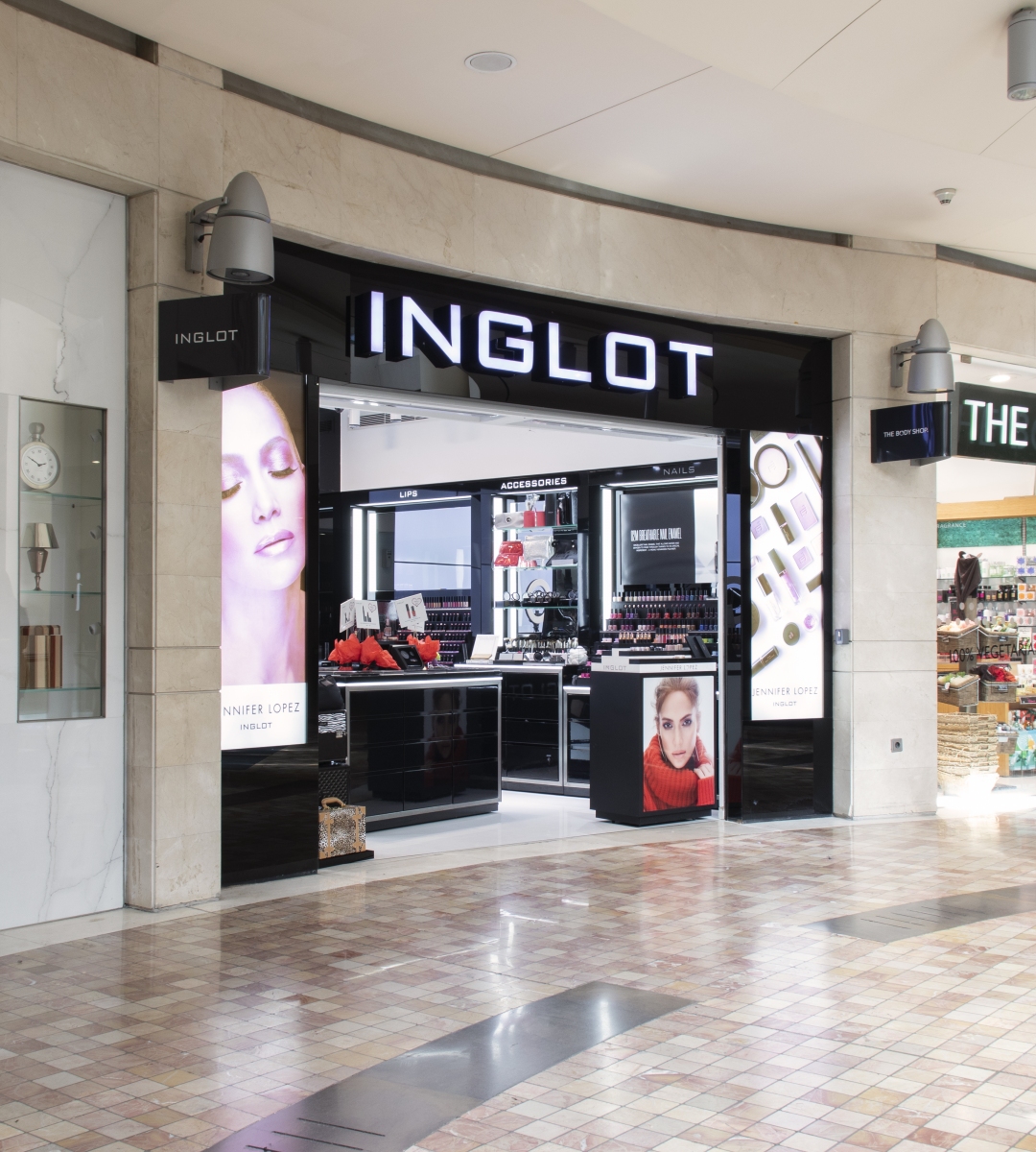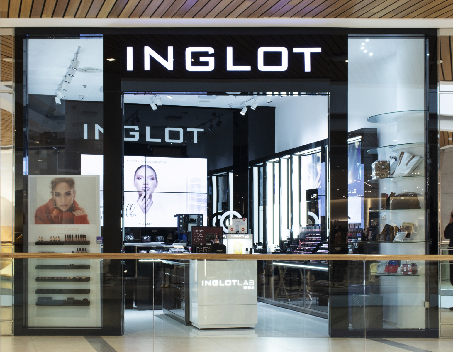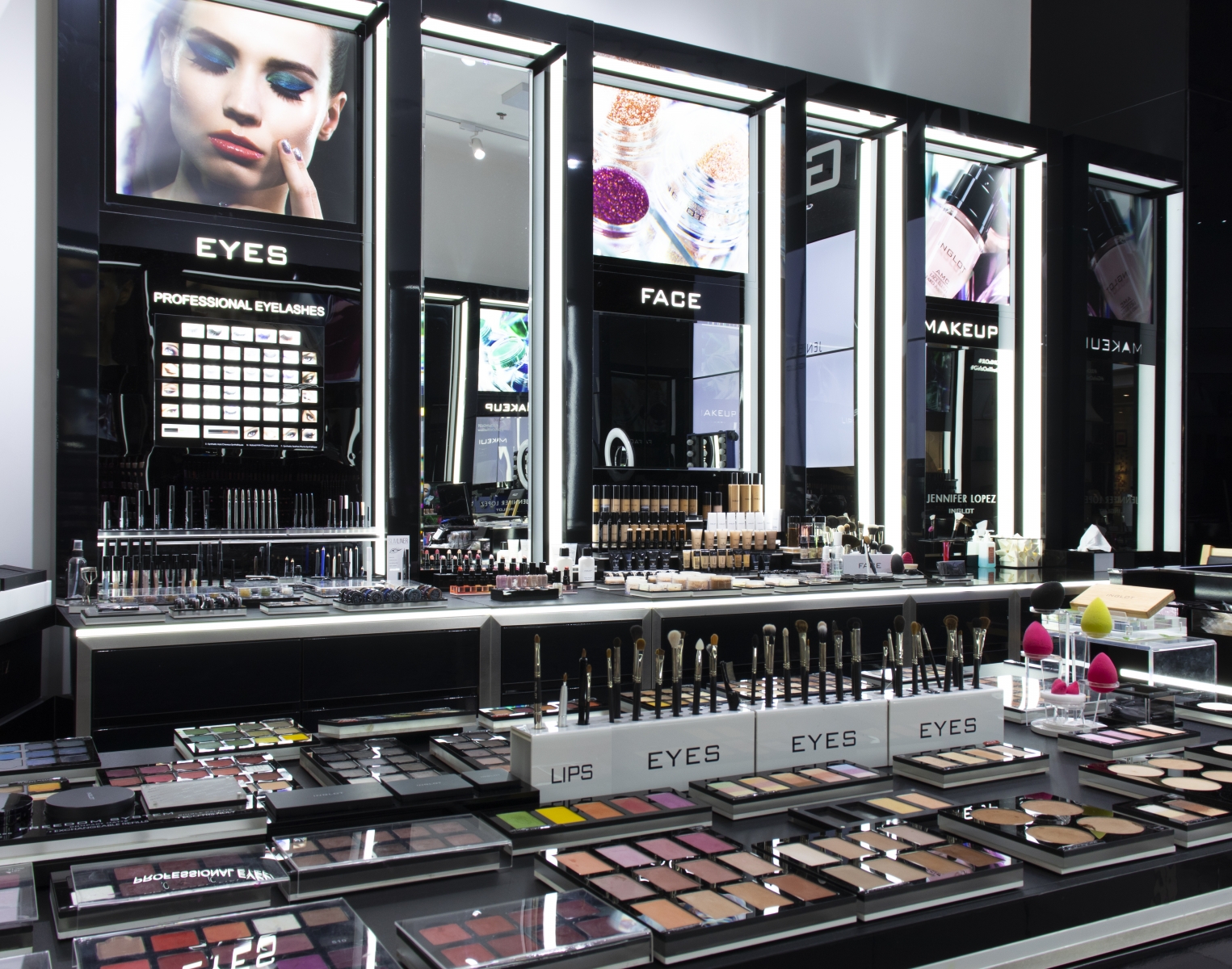 Seamless Back-painted Storefront with LED illuminated channel Letters. Seamless Back-painted glass back-wall with built-in TV system, flush with wall, and concealed cabinets. Mechanically operated storefront grille.
